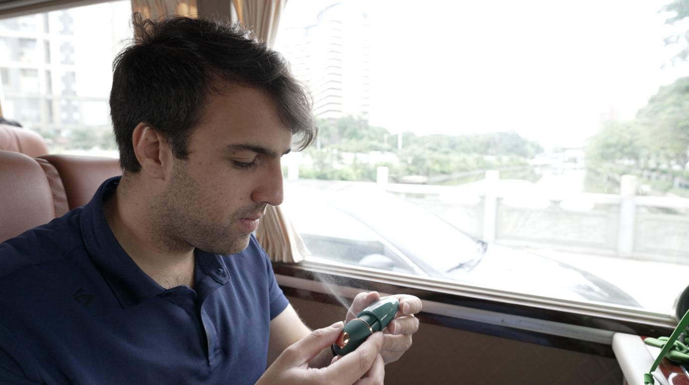 CGTN’s Omar Khan tries out some of the products designed at the Guangdong Industrial Design City. /CGTN